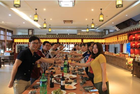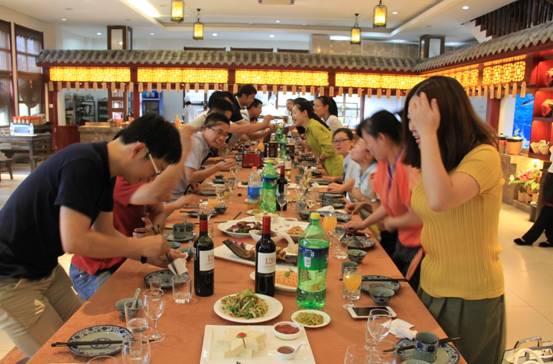 晚餐之前,為了活躍氣氛,人力資源部為大家精心準備了“筷樂傳遞”的游戲,長桌對面分為兩組進行PK,用筷子把乒乓球從頭傳到尾的隊為勝,獲勝的隊有項特權可以讓失敗的隊為自己夾菜吃。一個簡單的游戲讓大家體會到團隊配合的力量,也讓整個晚餐的氛圍愉悅起來。